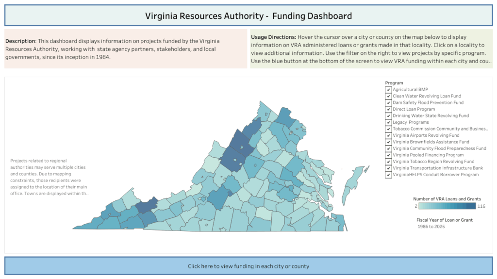 The Tableau dashboard displays information on VRA-funded projects, including recipient name, project description, VRA program, and dollar amount. Click on a city or county to view additional information or use filters to highlight specific programs and/or time periods. The shading on the default map shows the number of loans and grants by city or county; a secondary map is available to view funding amounts by locality.